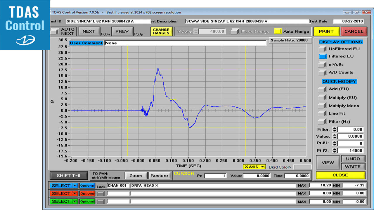 TDAS Control is the original set-up, control, viewing and export software developed by DTS. TDAS Control provides easy-to-use tools for configuring output timing, as well as advanced features such as automatic sensor assignment, detailed channel diagnostics, real-time display and squib fire for airbag testing. TDAS Control only works with TDAS G5 and TDAS PRO.