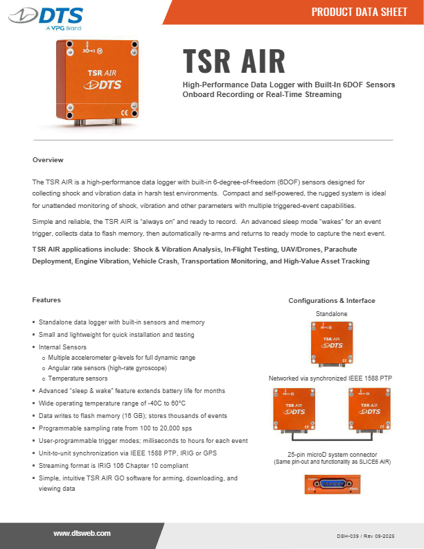 The TSR AIR is a universal data logger with built-in 6DOF (6 degree-of-freedom) for shock and vibration testing. The ultra-small, rugged TSR AIR features real-time streaming making it ideal for shock testing, inertial measurements, vibration modalities and asset tracking.